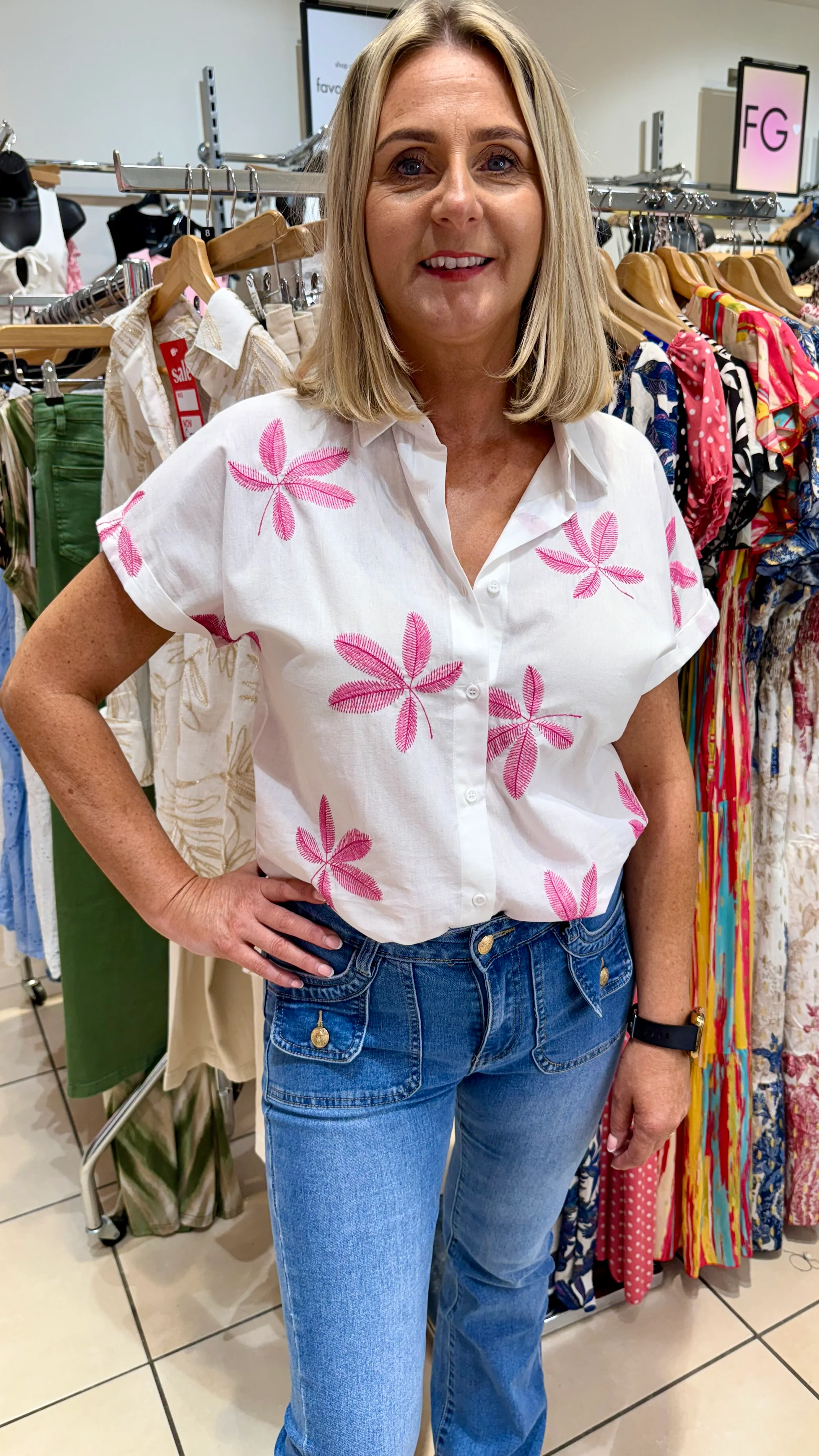 Tara - White/Pink Leaf Detail Embroidery Top