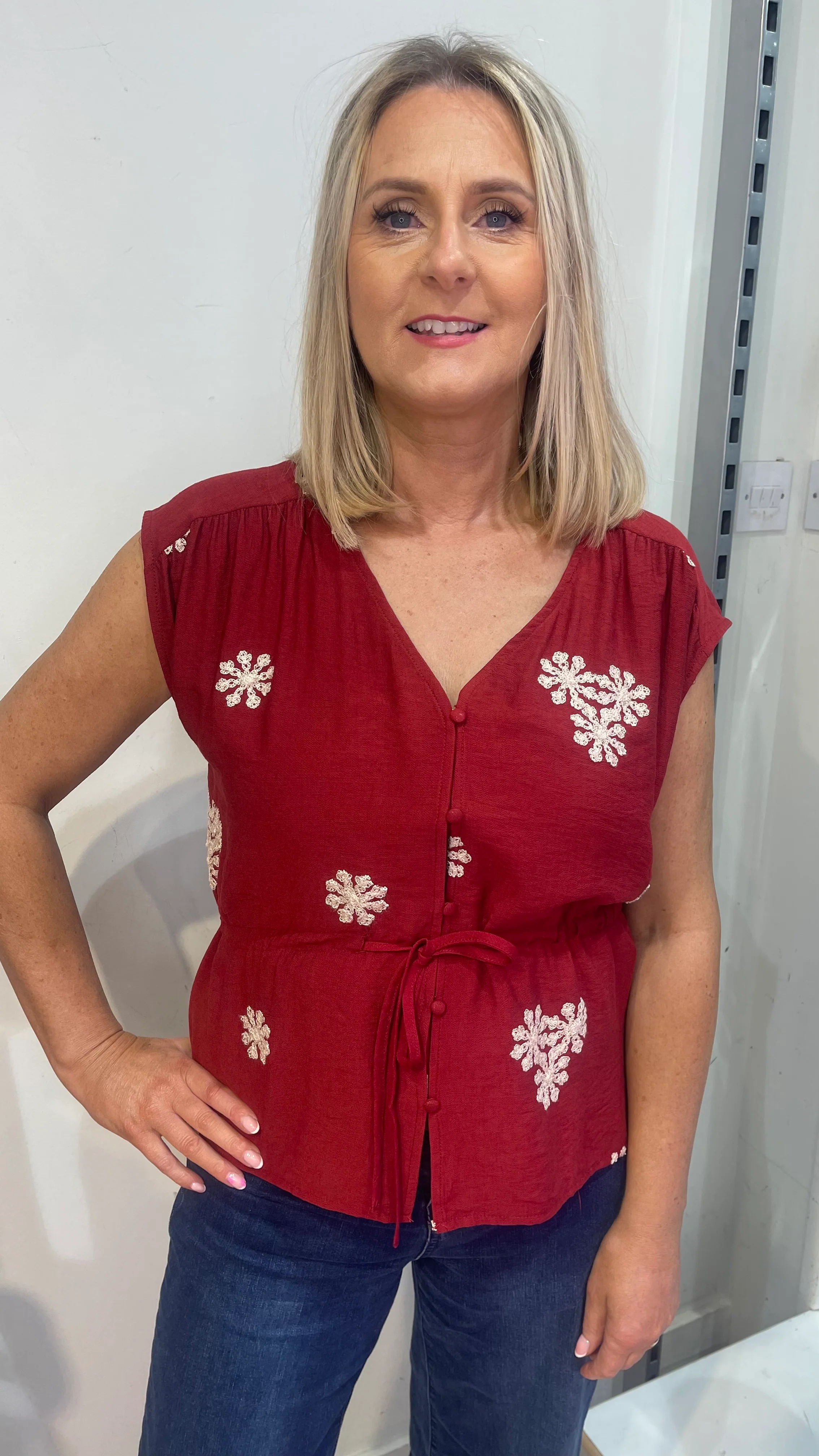 -70%Jane - Wine Embroidery Tie In Waist Top—